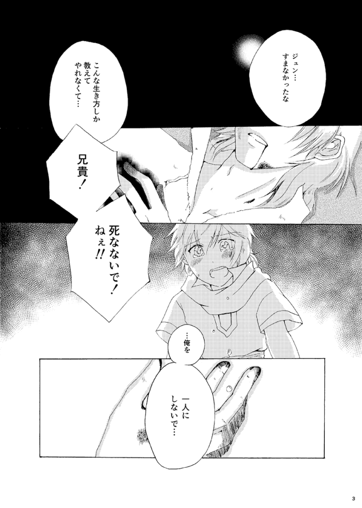 新刊は、ジュンちの過去を盛大に捏造してます。勝手にテキストにのみ存在している、拾ってくれたという兄貴出したり(サンプルで色々お察しです)自由にやっちゃってます。見逃した設定がないかと今でもガタガタ震えてます。人称は気にしたら負けです。強い心。