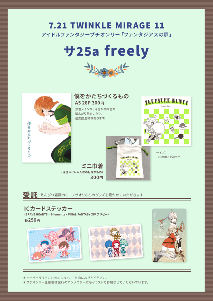 あと、お品書きにも書いていますが、プチオンリー主催様発行のアンソロジーに2Pイラストで参加させていただいてます。あと、ペーパーラリーにも参加予定です。頒布物の購入の有無に関わらずお渡しいたしますので、どうぞご自由にお持ちください。これから描くんですけど!淳あお風味強めのものになりそうです。描きたいんじゃぁあ…