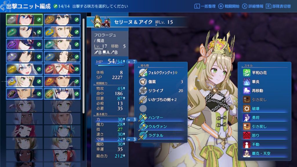 お次はセリーヌ。魔力があまり伸びないため一度は2軍に落ちたものの、戦力の余裕ができて、育成枠を出せるようになったタイミングで再度育成へ。結果はご覧の通り、びっくりするくらい平均的な数値になり、昔のパラディンみたいになったものの、剣も魔法も杖もつかえる万能キャラに仕上がった。あのふんわりバルーンスカートで剣を使っている姿がめっちゃお気に入り。あと、見た目に反して覚悟が決まってるめちゃくちゃやり手な王女というところも大変良い。スタルークとの支援が好きすぎて好きすぎる。