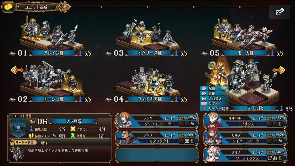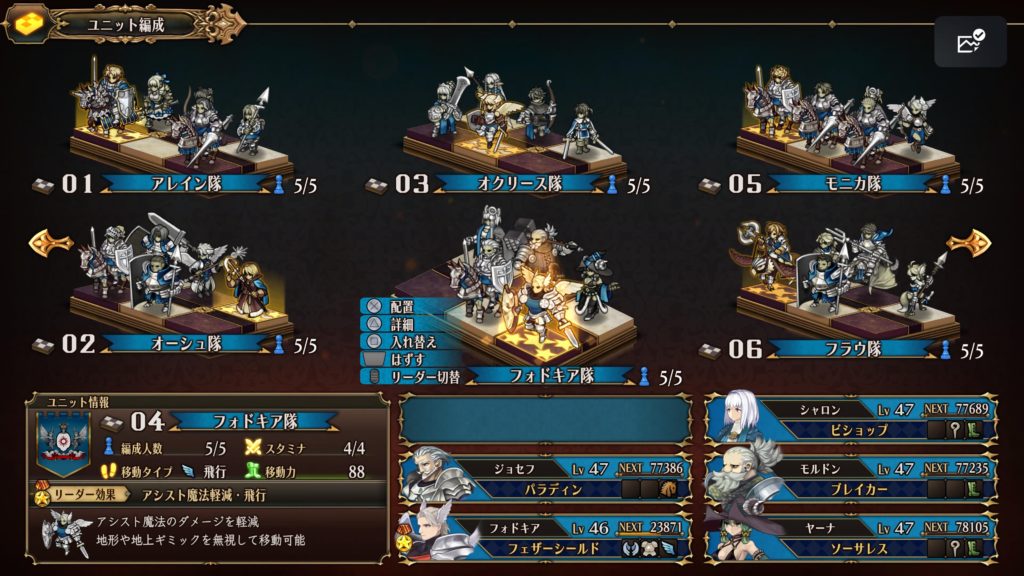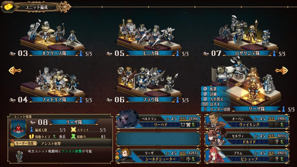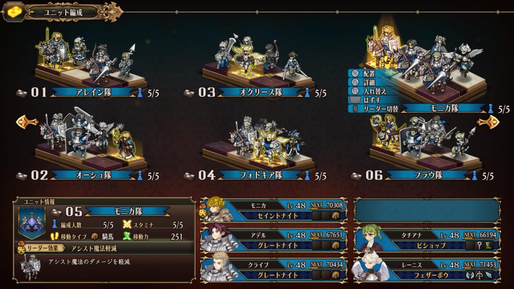 ざっとこんな感じでした〜〜。一応10部隊全部解放して5人配置できるようにはしたけど、残りの枠はレベルが上がってないメンバーを臨時で組んで、フィールドでのアシスト技を使うために駆り出されたり雑用PTになっていたので省略。